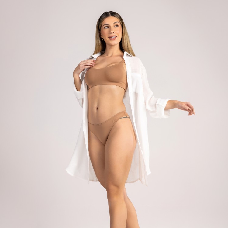 Na dúvida entre 2 tamanhos, opte pelo maior, assim você terá mais conforto e as peças não ficarão esbranquiçadas devido a elasticidade excessiva.