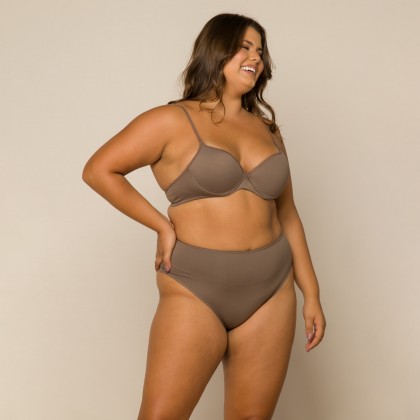 Sutiã castanho com bojo casca, modelo meia taça. Possuí alças reguláveis e fecho nas costas.