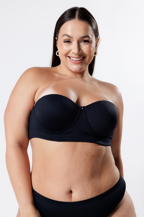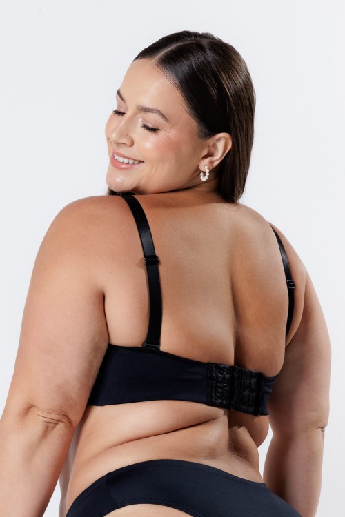 Alças com regulagem de comprimento e removíveis, podendo ser usadas paralelas (tradicional), sem alças (tomara que caia) ou cruzadas nas costas (nadador).