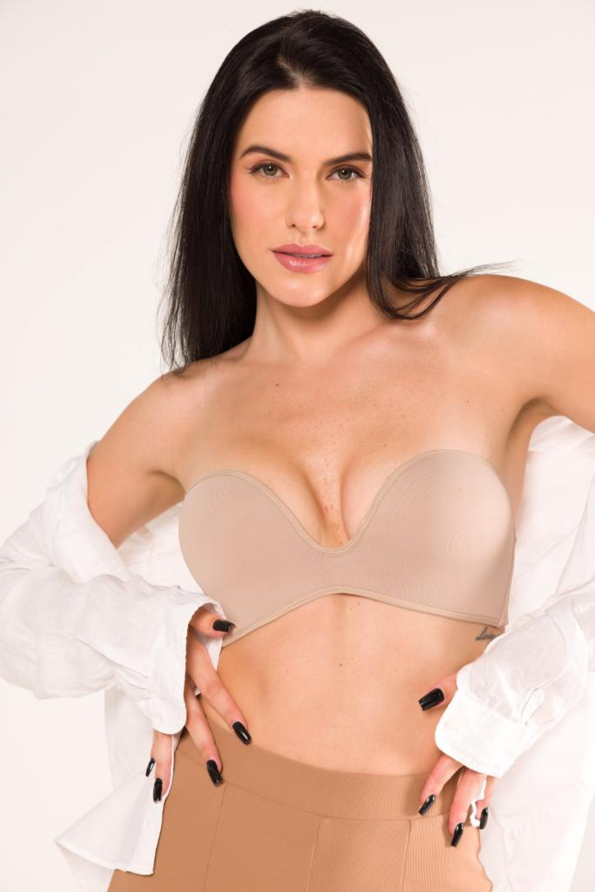 Sutiã tomara que caia com decote profundo e de alta sustentação.